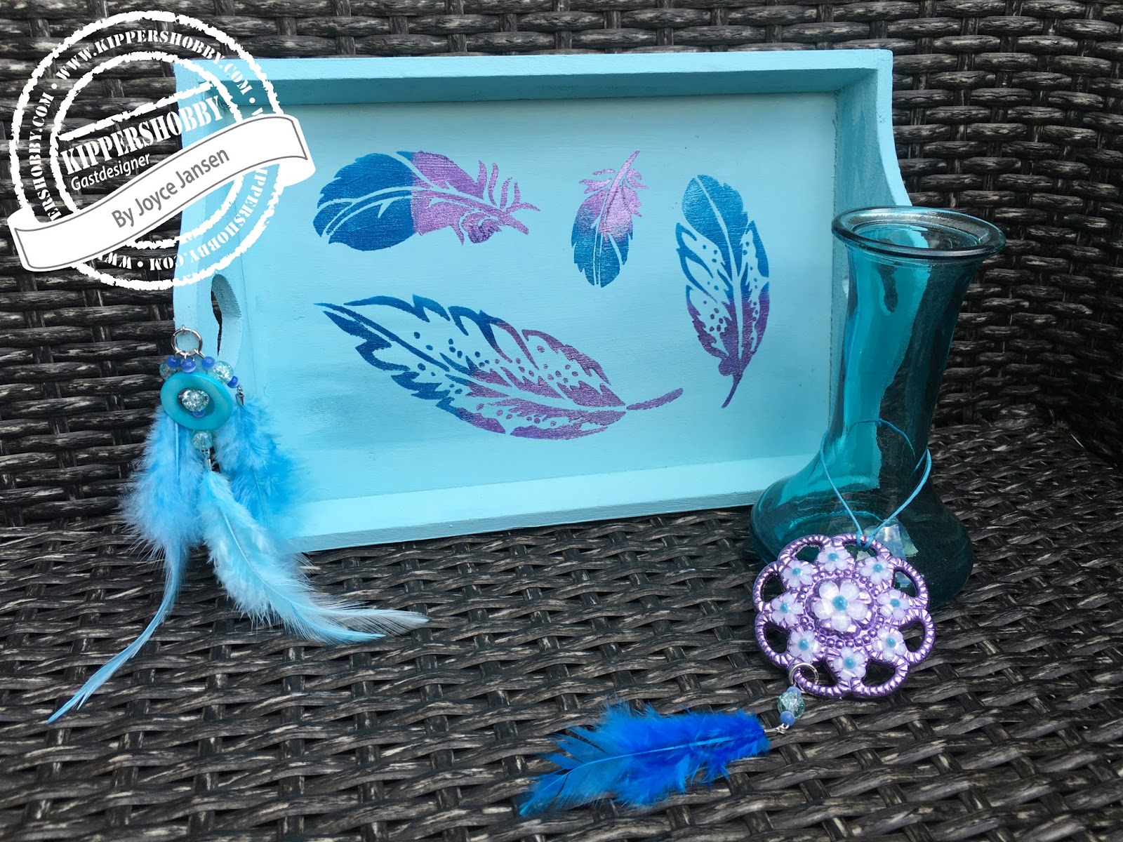 Avec un pochoir plumes et de petites éponges , j'ai appliqué les plumes avec du Maya Gold sur le plateau.